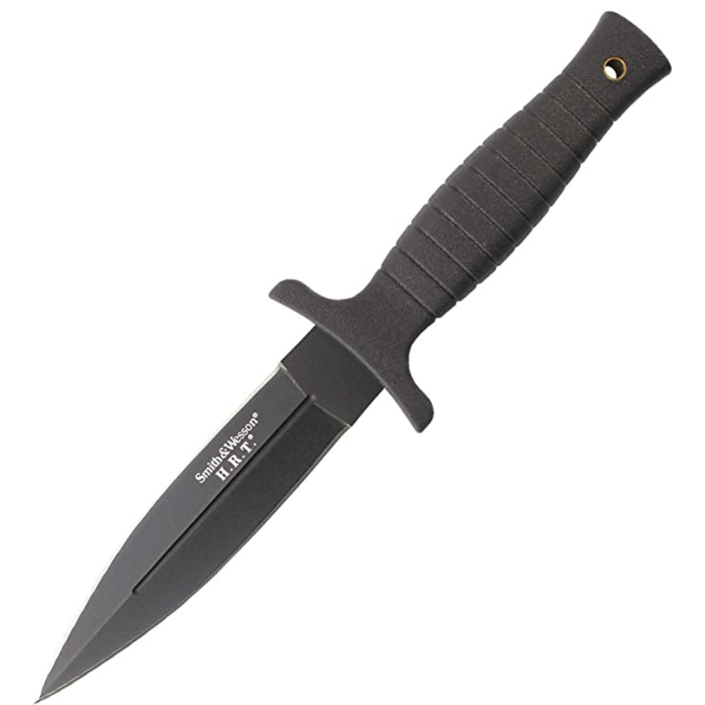 The handguard prevents slipping, and the blood groove and dual-edge blade provide added safety. The lanyard hole is convenient for attaching to a belt or boot, and the included sheath helps to keep the knife protected when not in use. Whether you are an experienced outdoorsman or just beginning your adventures, the Smith and Wesson SWHRT9B 9in High Carbon S.S. Fixed Blade Knife is an excellent choice for all your knife needs.