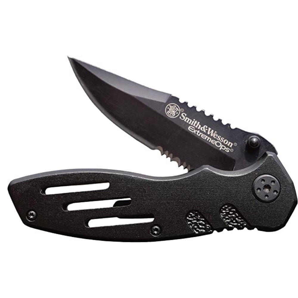 The Smith & Wesson Extreme Ops SWA24S is a reliable and durable folding knife that is perfect for outdoor, tactical, and Survival situations. The blade is made of 7Cr17MoV Black Oxide High Carbon Stainless Steel, and the handle is made of aluminum, making it both strong and lightweight.