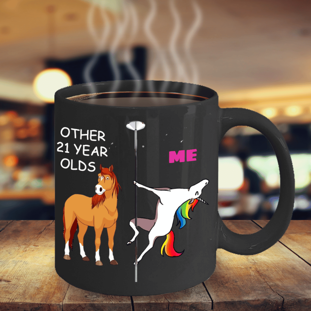 This high-quality black porcelain coffee mug is the perfect gift for any unicorn-loving 21-year-old woman. Featuring the playful and humorous message "Other 21 Year Olds Me Unicorn", this mug is sure to put a smile on her face every time she uses it.