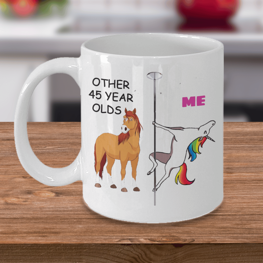 With this humorous and unique 45th Birthday Mug for Women, celebrate this milestone birthday. This white porcelain coffee cup, which reads "Other 45 Year Olds Me Unicorn," is the ideal present for the tea or coffee enthusiast in your life. This premium mug was packaged and shipped from the USA and is 100% microwave and dishwasher safe, making it practical for daily use. It is shipped in a specially built styrofoam container to guarantee its safe arrival. Place your order right away to give your loved one a truly spectacular birthday present!