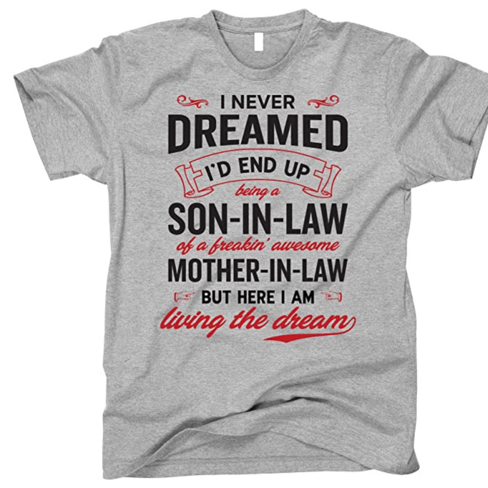 Looking for a fun and unique gift for your son-in-law? Look no further than this "I Never Dreamed I'd Be Son-in-Law of Freakin' Awesome Mother-in-Law" shirt! Made in the USA and imported, this shirt is made of a preshrunk cotton/poly blend that is light weight and very comfortable. The shirt features a screen-printed design that reads "I Never Dreamed I'd End Up Being A Son-in-Law of a Freakin' Awesome Mother-in-Law." This shirt is perfect for birthdays, Christmas, Father's Day, or just as a fun way to show your son-in-law how much you appreciate him. Available in an athletic/slim fit, order a size larger if you prefer a looser fit. So why wait? Get your son-in-law this awesome shirt today!