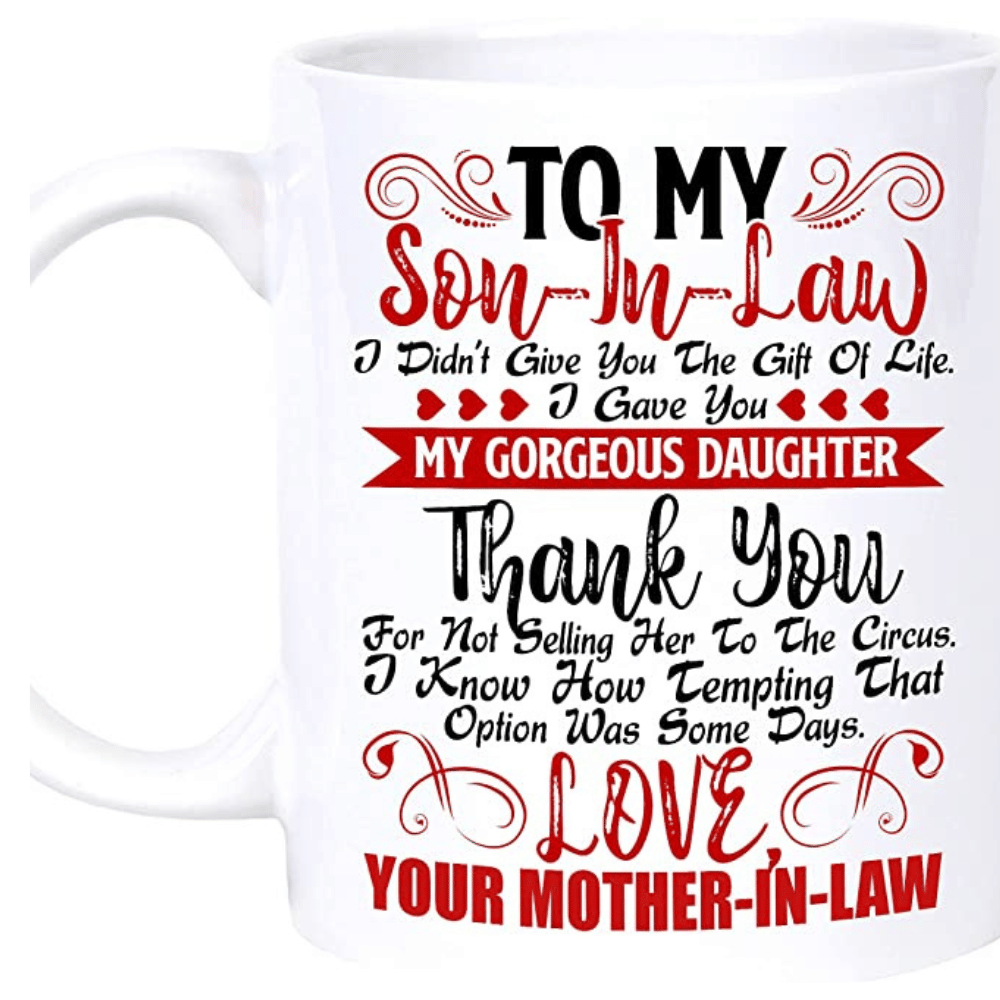 Introducing the PerfectoStore Personalize Son-in-Law gifts, To My Dear Son In Law Mug - a thoughtful and heartwarming gift for your special son-in-law. This 11oz coffee mug is a perfect birthday gift for your son in law, and it can also be given on occasions like Christmas, Father's Day, Mother's Day, Valentine's Day, and more. The mug features a beautiful message printed on both sides that reads, "To My Dear Son In Law I Didn't Give You The Gift Of Life I Gave You My Gorgeous Daughter Mug- Dear Son-In-Law Christmas Presents Gifts, Birthday gifts - Son-In-Law from Mother-In-Law Coffee Cup 11oZ". With its large, easy-grip handle, it is comfortable to hold and perfect for everyday use. It is also safe for use in the microwave and dishwasher and can withstand both house and restaurant use. This personalized gift is sure to make your son-in-law feel loved and appreciated. It comes in a box gift packing, making it an awesome gift option for your loved one on their special day. Perfectostore also offers a 100% Money-Back Guarantee for 30 days, no questions asked, ensuring your satisfaction. Make your son-in-law feel extra special with this personalized mug that expresses your love and appreciation for him.