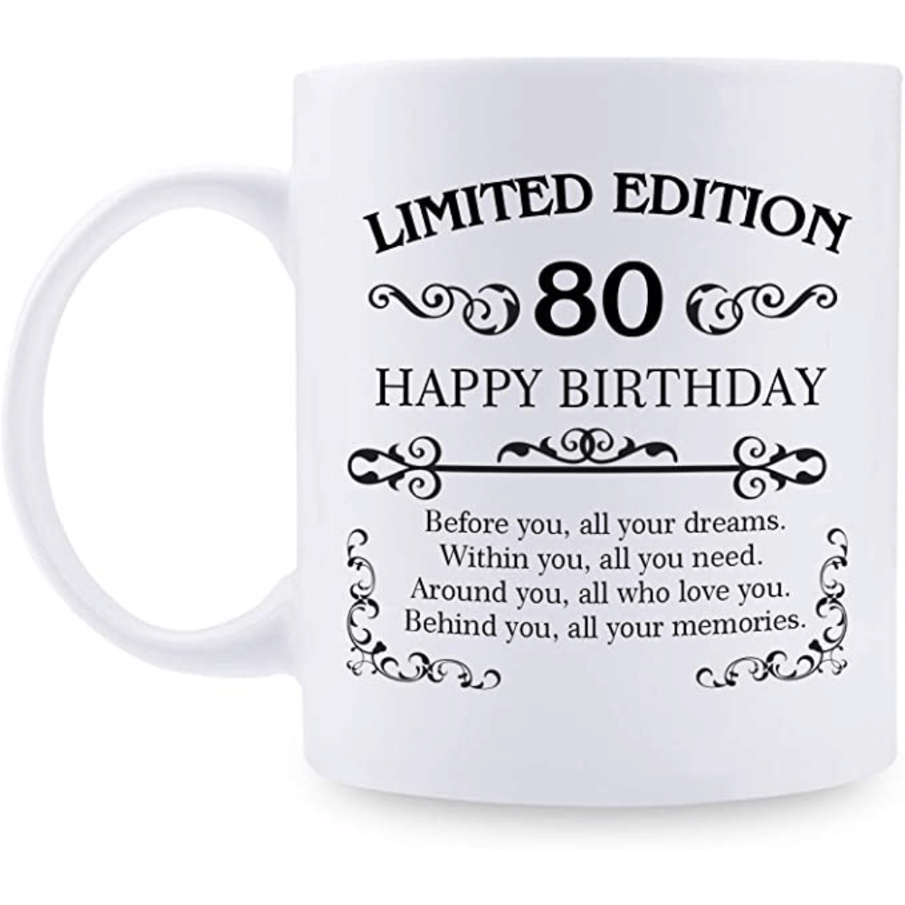The 80th Birthday Gifts for Women Men - 11 oz Coffee Mug is a perfect gift to commemorate someone's 80th birthday. The mug features the lettering "LIMITED EDITION 80 HAPPY BIRTHDAY Before you, all your dreams. Within you, all you need. Around you, all who love you. Behind you, all your memories." printed on both sides of the mug, making it a great gift for both women and men.
