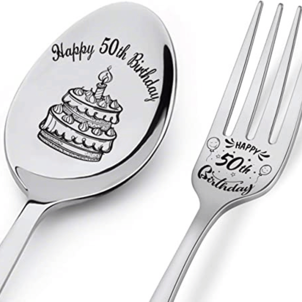 The Happy 50th Birthday Spoon&Fork Gifts are the perfect personalized gift for your loved ones' special day. The spoon&fork set is laser engraved with the text "Happy 50th Birthday" and intricate patterns, making it a unique and thoughtful gift that they will treasure for years to come.