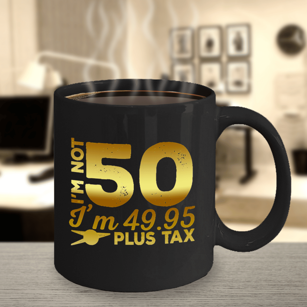 Looking for a humorous 50th birthday gift for a friend or family member? Look no further than the "I'm Not 50 I'm 49.95 Plus Tax" coffee mug! Made of high-quality black porcelain, this 11 oz mug is the perfect addition to any coffee or tea lover's collection.