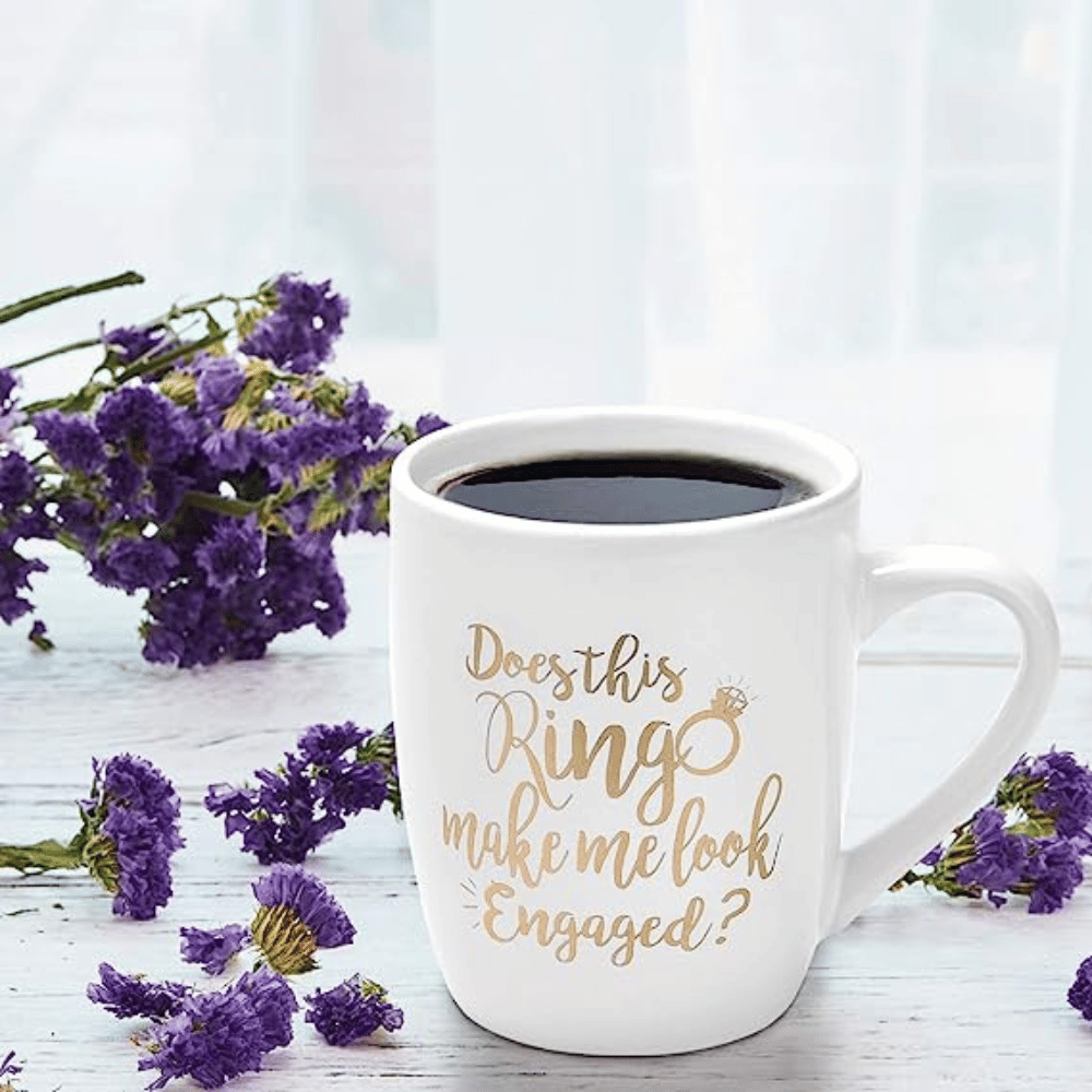 Introducing the Maustic Funny Coffee Mug - a delightful novelty coffee mug that is sure to bring laughter and joy to your loved one. With its humorous message, "Does this ring make me look engaged?", this mug is the perfect gift for women on special occasions such as engagements, anniversaries, birthdays, Christmas, or simply to celebrate love and laughter.