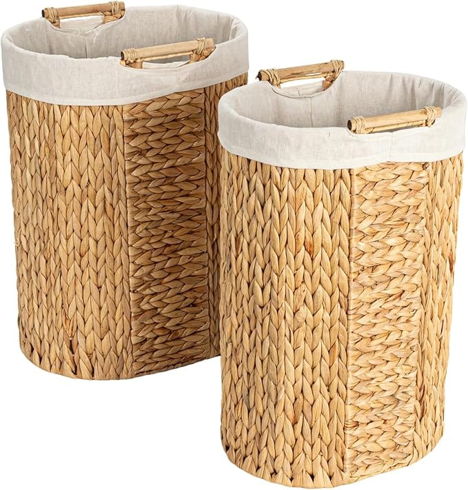 This beauty is crafted from natural water hyacinth, giving it a rustic yet elegant look. It comes with two removable canvas liners, making sorting a breeze.