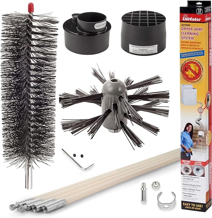 The Linteater Rotary Dryer Vent Cleaning System is a comprehensive solution that includes multiple attachments for different cleaning scenarios. It's designed to be used with or without a power drill.
