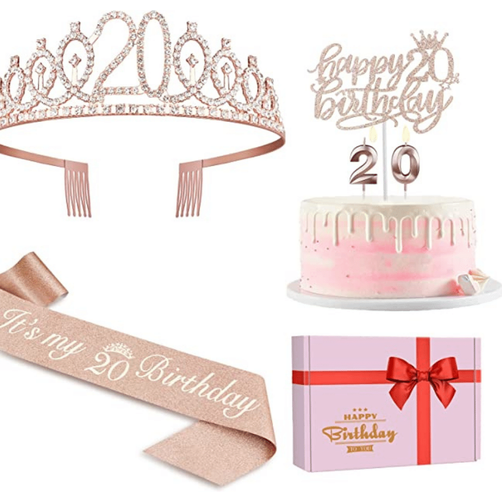 Ready for a happy 20th birthday celebration? Look no further! From 20th birthday sash and crown to happy 20th cake topper and numeral candles, we have the decorations you need for an unforgettable event. Our sparkly 20th birthday crown is made with high quality alloy and rhinestone, perfect for making a statement at the party. The happy 20th sash is constructed with glitter satin and foil lettering—plus it comes with the bonus of a beautiful gold charm pin. Top your cake off with the happy 20th cake topper, then finish off your display with numeral candles in two colors: rose gold and white. All of these decorations come packed in a pretty gift box ready for lovely presentation. Now that you have happy 20th birthday gifts sorted out, let’s get this party started!This gift will make the birthdays party so special.