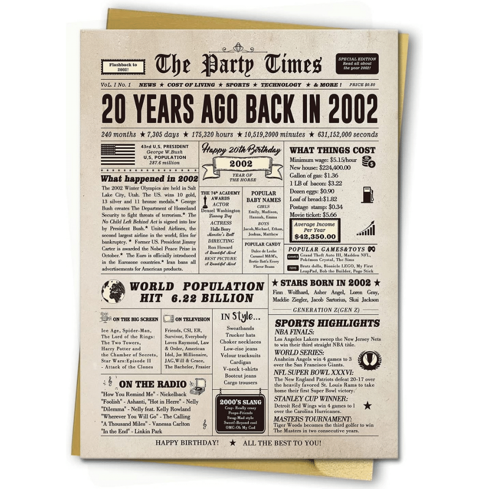 Celebrate a happy 20th birthday with the perfect gift! Grab your loved one an amazing jumbo happy back in 2002 birthday card to give them the best possible recognition for this special milestone. Our card is 7.9 x10.6 inches and comes enclosed with a gold matching envelope and protective bag to keep it safe from any damage. The internal white background allows you to truly express your love for your sister, brother, friend, niece or other person of important in your life - write down all your feelings so that they know how much you care about them! Don’t forget that all our incredible happy 20th birthday gifts are shipped from the United States too!