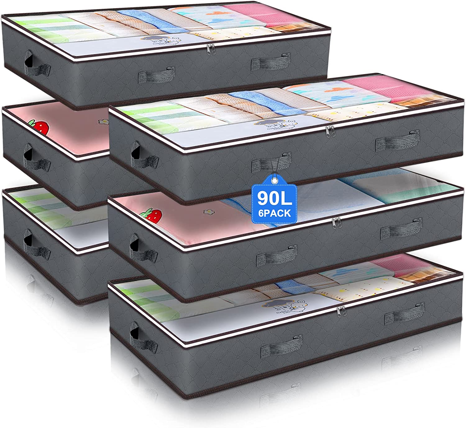 90L Under Bed Storage Containers, Large Capacity Underbed Storage Bags Organizer, Thick Fabric Storage Bins with Clear Window and Reinforced Handles for Blanket, Comforter, Bedding, Clothes, 6 Pack