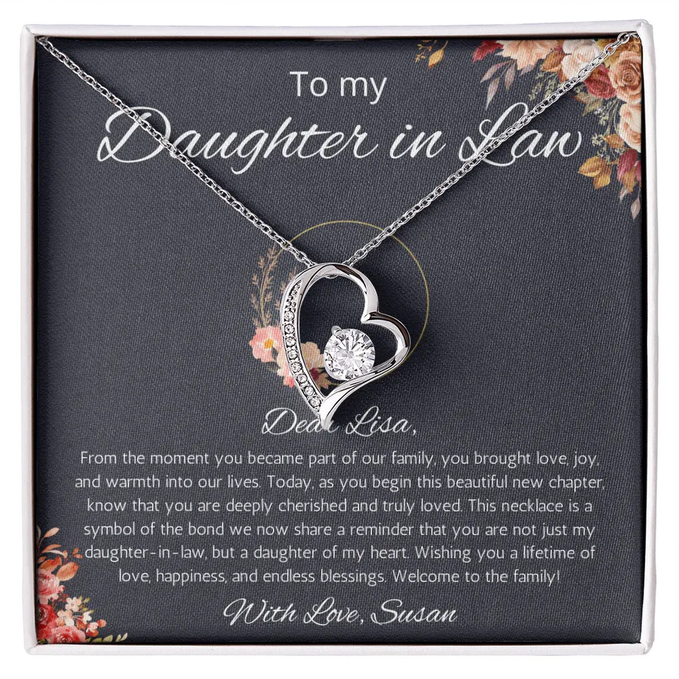 "To My Beautiful Daughter-in-Law – From the moment you became part of our family, you have brought love, joy, and happiness. I am grateful for you and so blessed to call you family. May this necklace remind you of the love and warmth that surrounds you always."