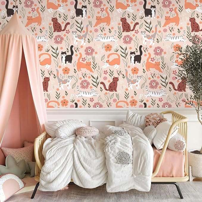 VEELIKE Pink Chasing Cat Wallpaper Stick and Peel Cute Kitten Floral Peel and Stick Wallpaper for Kids Room Playroom Nursery 17.7''x118'' Animal Wall Paper Removable Self Adhesive Pink Contact Paper